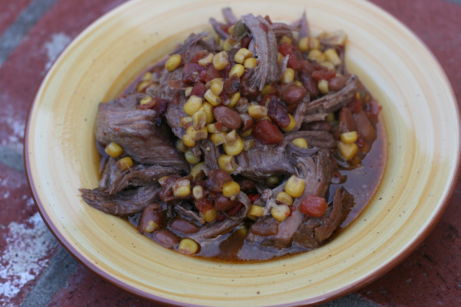 There's nothing like a big hunk of meat to warm you up on a chilly day. This is man-pleasin' food. My brother, dad, and Adam all ate big helpings. Although I only used 2 pounds of meat, the beans and the corn really stretches both the servings and the number served.
