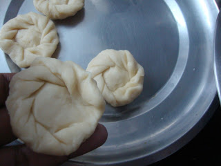 To make the badusha with pleats or folds, flatten the ball like the above,