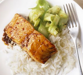 Salmon fillets are cooked straight from frozen for convenience - the sticky glaze helps to keep the fish moist while it cooks.