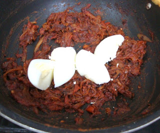 She told him that this is a dry dish with the masala all clinging to the egg, but the burst of flavours that happen because of the slightly burnt onions, spicy masala makes up all.